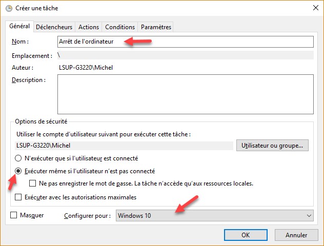 Cliquez sur Démarrer ou appuyez sur la touche Windows du clavier, tapez planificateur et cliquez sur Planificateur de tâches dans la partie supérieure du menu Démarrer. Cette action affiche la fenêtre Planificateur de tâches. Lancez la commande Créer une tâche dans le menu Action. La boîte de dialogue Créer une tâche s’affiche. Sous l’onglet Général, définissez :