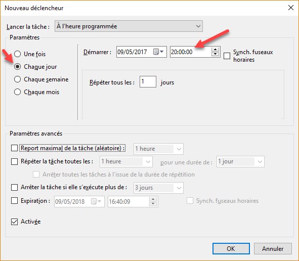 Basculez sur l’onglet Déclencheurs, puis cliquez sur Nouveau. La boîte de dialogue Nouveau déclencheur s’affiche. Supposons que vous vouliez arrêter l’ordinateur à 20 heures. Sélectionnez :