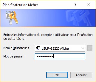 Validez en cliquant sur OK, puis fermez la boîte de dialogue Créer une tâche en cliquant sur OK. La boîte de dialogue Planificateur de tâches s’affiche. Entrez le mot de passe de votre compte et cliquez sur OK :