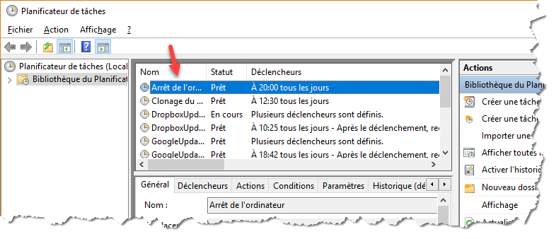 La nouvelle tâche est mémorisée. Elle apparaît dans le volet central du Planificateur des tâches. Tous les jours, l’ordinateur s’arrêtera automatiquement à 20 heures :