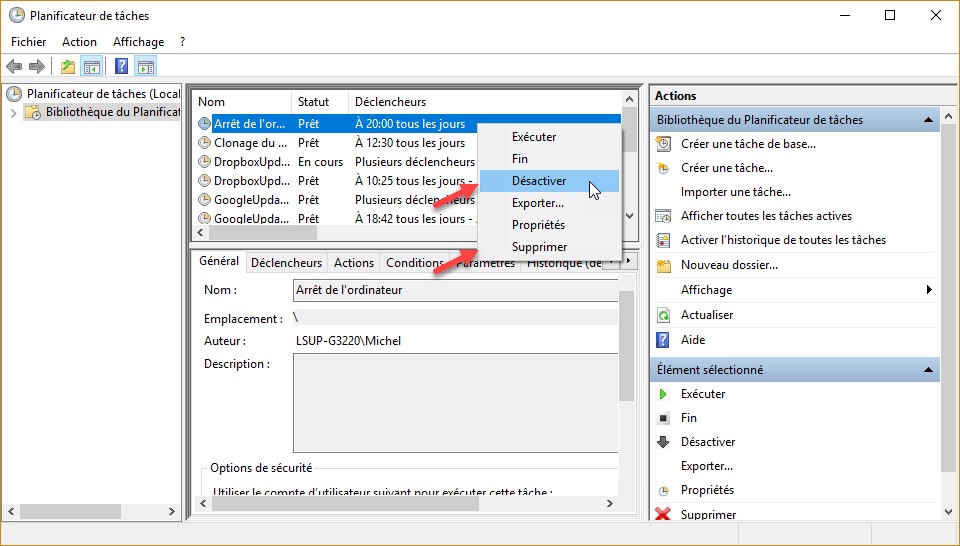 Ouvrez le Planificateur de tâches, cliquez du bouton droit sur la tâche Arrêt de l’ordinateur dans le volet central et sélectionnez Désactiver ou Supprimer dans le menu selon si vous voulez suspendre ou supprimer l’arrêt programmé de l’ordinateur :