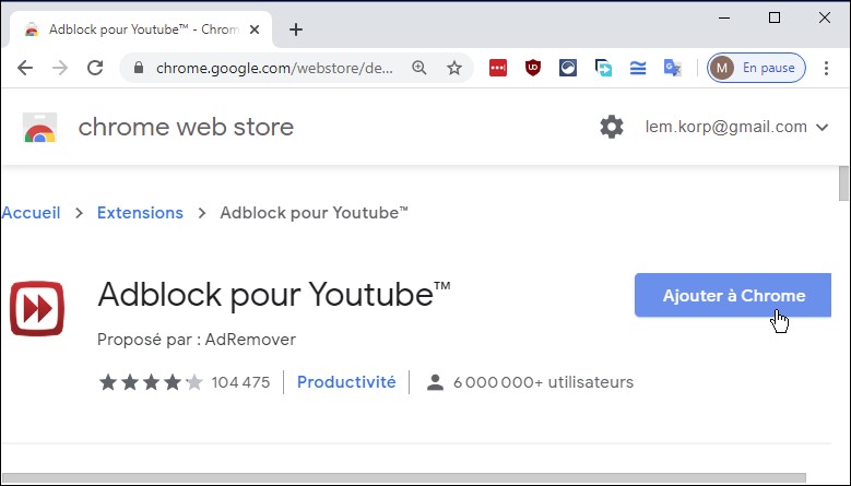 Ouvrez Chrome et allez sur la page de l’extension Adblock pour Youtube en cliquant sur ce lien. Cliquez sur Ajouter à Chrome, puis sur Ajouter l’extension :