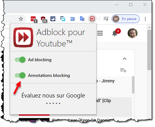 Par défaut, toutes les publicités sont maintenant bloquées. Si vous voulez également bloquer les annotations qui apparaissent sur les vidéos, cliquez sur l’icône Adblock for Youtube et basculez l’interrupteur Annotations blocking en position Activé :