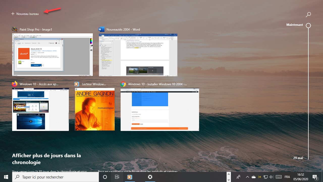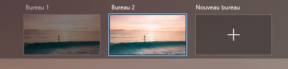 Des miniatures représentent les applications ouvertes et l’icône Nouveau bureau, dans l’angle supérieur gauche de l’écran permet de créer un bureau virtuel :