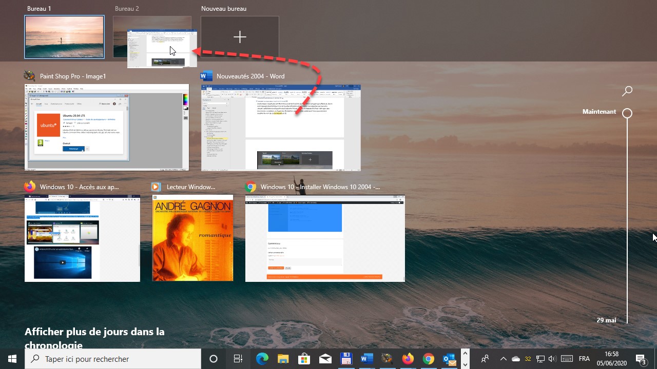 Pour transférer une application d’un bureau à un autre, cliquez sur l’icône Affichage des tâches ou appuyez sur Windows + Tab, puis glissez-déposez l’application sur la vignette du bureau destination :