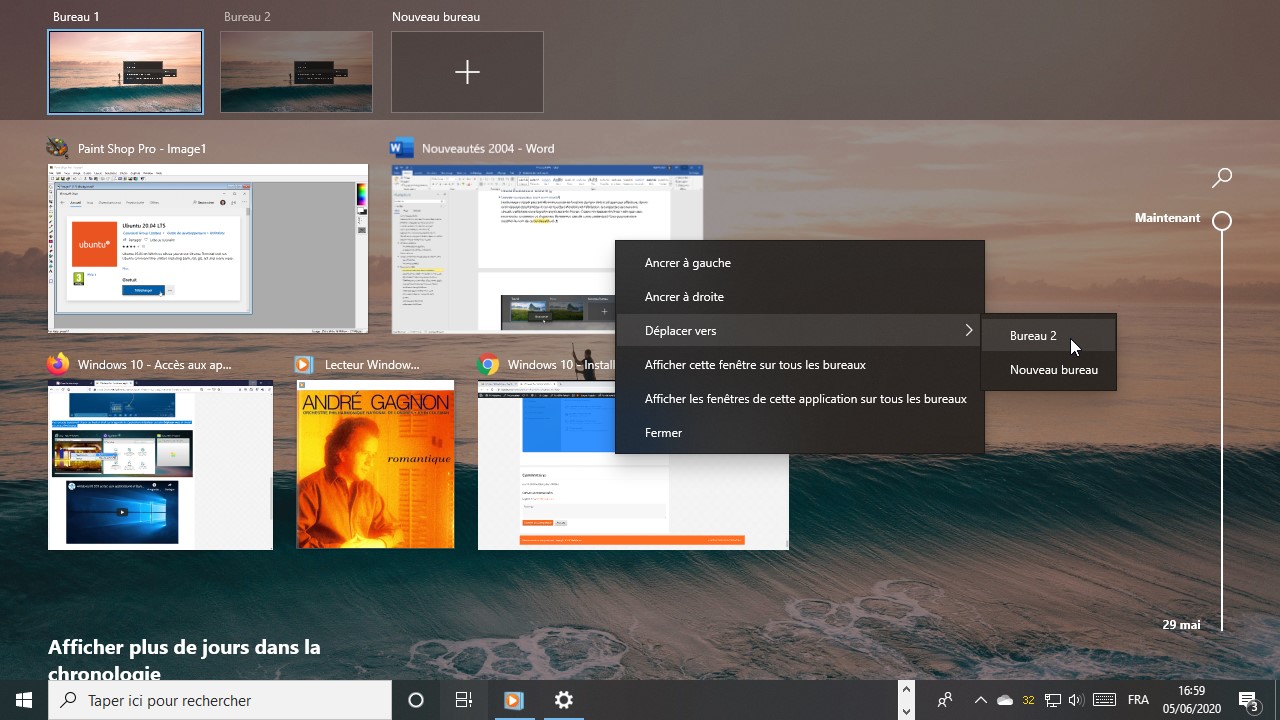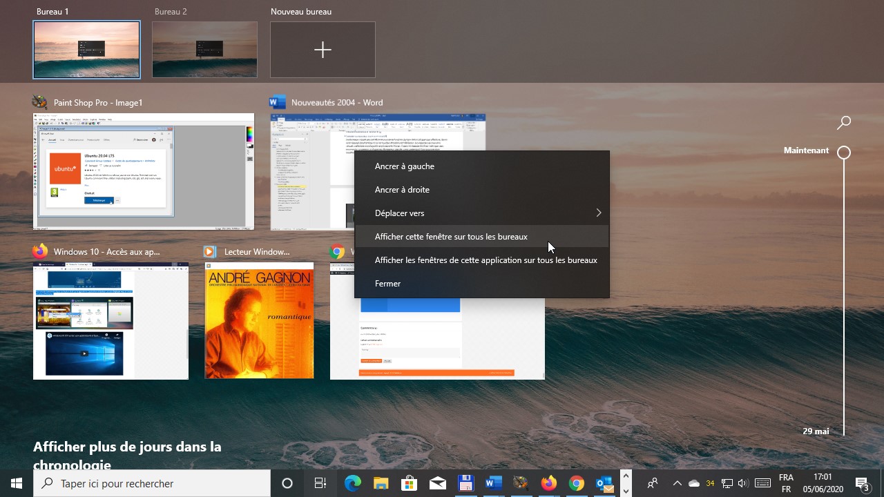 Enfin, vous pouvez choisir d’afficher une fenêtre sur tous les bureaux virtuels. Appuyez simultanément sur les touches Windows et Tab. Cliquez sur bouton droit sur la vignette de l’application concernée, et sélectionnez Afficher cette fenêtre sur tous les bureaux ou Afficher les fenêtres de cette application sur tous les bureaux selon l’effet recherché :