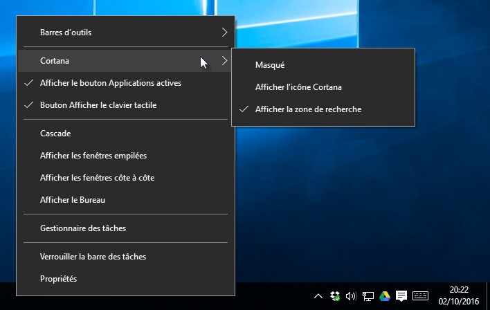 | Afficher la zone de recherche | Affiche l’icône et la zone de recherche de Cortana |
