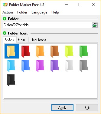 Installez cet utilitaire en acceptant toutes les options par défaut, puis lancez-le. Pour colorer un dossier, il vous suffit de le sélectionner dans Folder puis de choisir une couleur dans Folder Icon, éventuellement en basculant sur l’onglet Main ou User Icons :