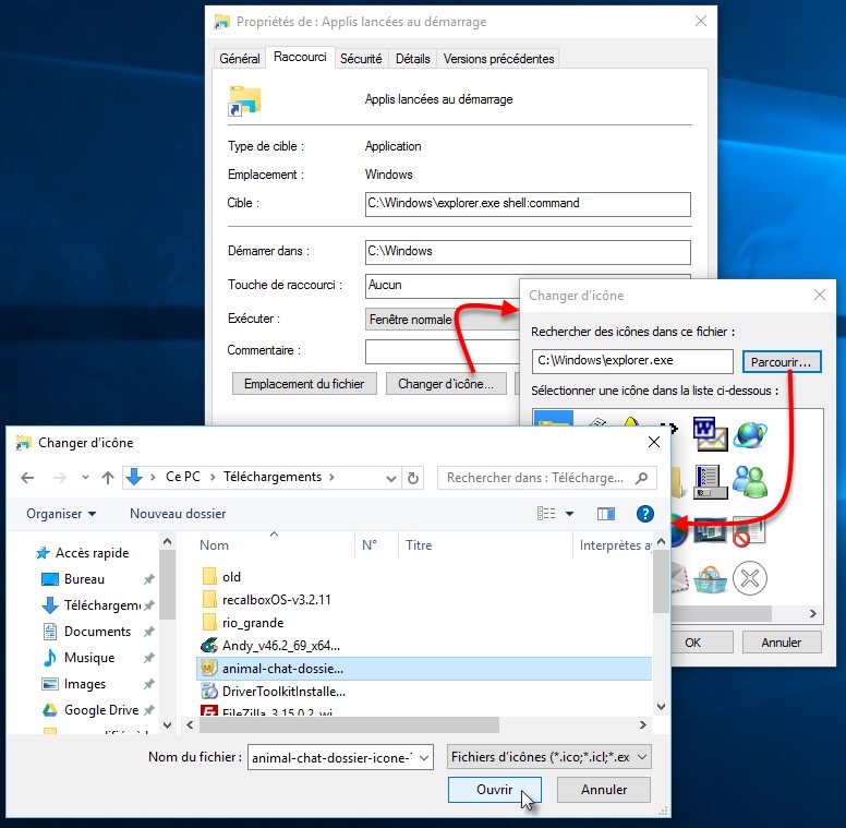 La boîte de dialogue des propriétés s’affiche. Cliquez sur Changer d’icône. La boîte de dialogue Changer d’icône s’affiche. Cliquez sur Parcourir, désignez l’icône que vous venez de télécharger, puis cliquez sur Ouvrir :