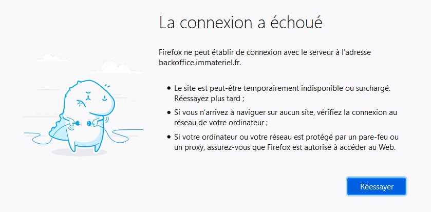 Si le DNS est en panne, indisponible ou altéré, certains ou tous les sites Web ne sont plus accessibles et un message de ce type s’affiche dans le navigateur (le message peut être différent en fonction du navigateur utilisé) :