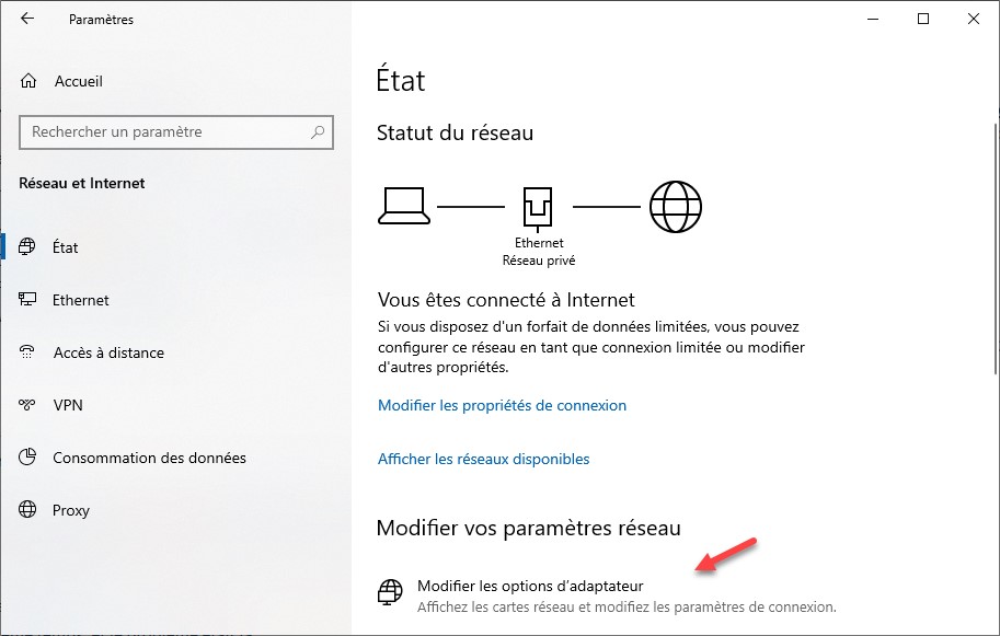 Cliquez sur Démarrer puis sur Paramètres (l’icône en forme de roue dentée). La fenêtre Paramètres Windows s’affiche. Cliquez sur Réseau et Internet. La fenêtre État s’affiche. Cliquez sur Modifier les options d’adaptateur, sous Modifier vos paramètres réseau :