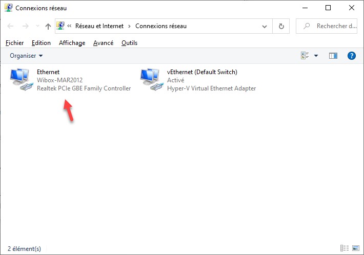 La fenêtre Connexions réseau s’affiche. Son contenu dépend de l’interface réseau utilisée. Ici par exemple, une connexion Ethernet Realtek PCIe est disponible. Double-cliquez sur votre connexion :