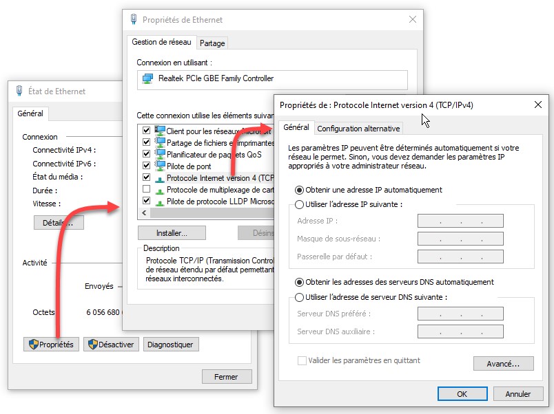 La boîte de dialogue État s’affiche. Cliquez sur Propriétés. La boîte de dialogue des propriétés du connecteur s’affiche. Cliquez sur Protocole Internet version 4. La boîte de dialogue des propriétés du protocole Internet version 4 s’affiche. Voici ce que vous devriez obtenir :