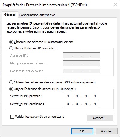 Voici par exemple comment configurer cette boîte de dialogue pour utiliser le DNS de Google :