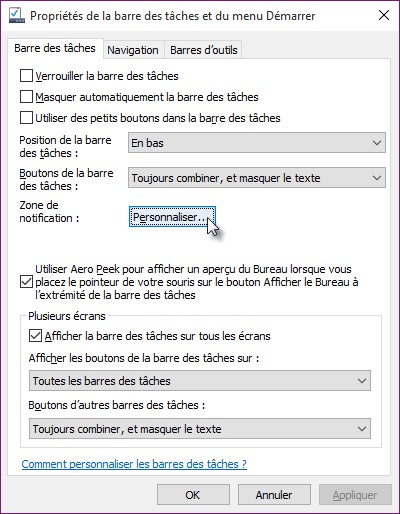 Cliquez du bouton droit sur une partie inoccupée de la barre des tâches et sélectionnez Propriétés dans le menu. La boîte de dialogue Propriétés de la barre des tâches et du menu Démarrer s’affiche.