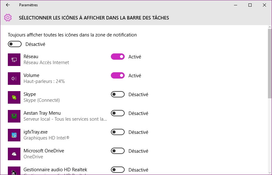 Pour qu’une de ces icônes apparaisse de façon permanente dans la zone de notifications, il suffit de la glisser-déposer dans la zone de notifications depuis le menu Afficher les icônes cachées :