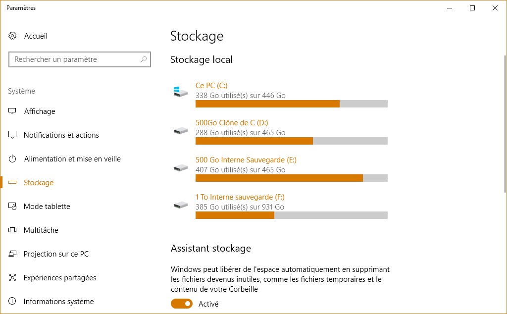 Cliquez sur Démarrer, tapez stockage et cliquez sur Stockage dans la partie supérieure du menu Démarrer. Cette action affiche la fenêtre Paramètres, onglet Stockage sélectionné :