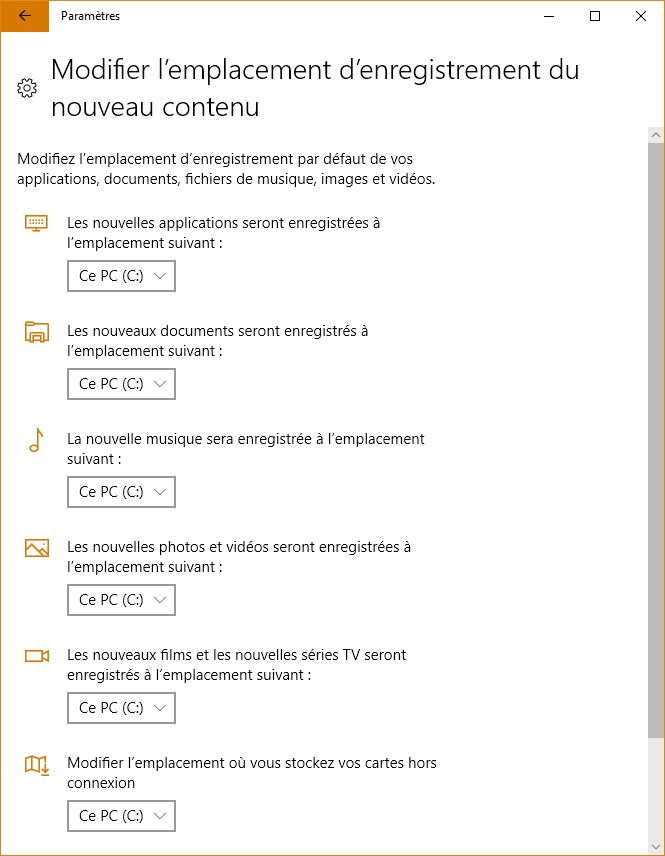 Déplacez-vous dans la partie inférieure de la fenêtre et cliquez sur le lien Modifier l’emplacement d’enregistrement du nouveau contenu, sous Autres paramètres de stockage. Vous pouvez alors choisir le disque sur lequel seront stockés les nouvelles applications et le nouveau contenu (documents, musique, photos, vidéos, films et cartes hors connexion) :