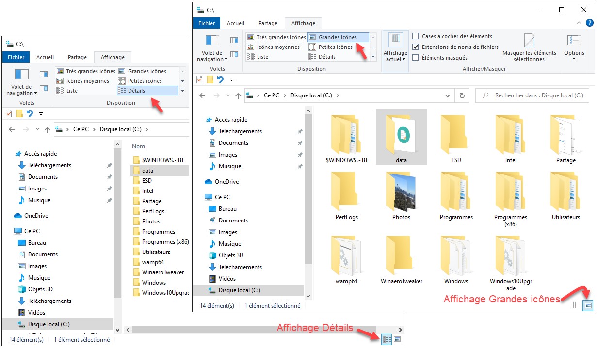 Il est également possible d’utiliser les icônes Détails et Grandes icônes dans l’onglet Affichage du ruban. Mais il faut bien avouer que ces deux nouvelles icônes sont bien plus pratiques.