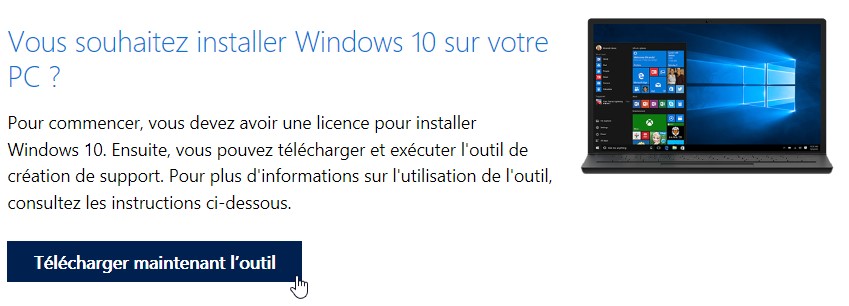 Commencez par insérer la clé sur un port de votre ordinateur, puis rendez-vous sur la page https://www.microsoft.com/fr-fr/software-download/windows10 et cliquez sur le bouton Télécharger maintenant l’outil, sous Vous souhaitez installer Windows 10 sur votre PC :