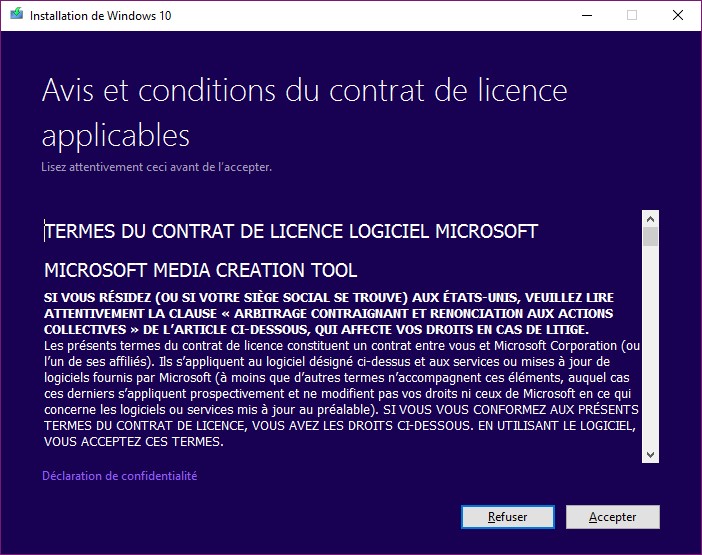 Une fois l’outil téléchargé, exécutez-le. Le contrôle du compte d’utilisateur se manifeste. Validez l’exécution du programme MediaCreationTool.exe en cliquant sur Oui. Quelques instants plus tard, une boîte de dialogue s’affiche sur l’écran :