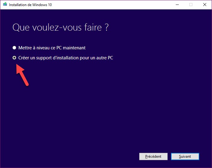 Cliquez sur Accepter. Une deuxième boîte de dialogue s’affiche. Sélectionnez l’option Créer un support d’installation pour un autre PC et cliquez sur Suivant :