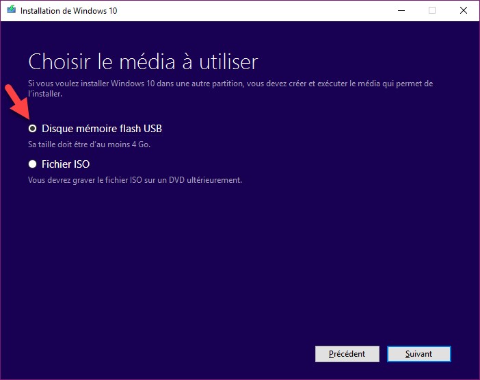 La prochaine boîte de dialogue vous demande de choisir entre l’utilisation d’une clé USB ou la création d’un fichier ISO. Sélectionnez Disque mémoire flash USB et cliquez sur Suivant :