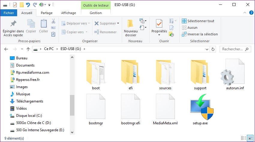 Lorsque le téléchargement est terminé, il est vérifié. Cette opération est assez rapide. Commence alors la création du média à proprement parler. Selon le type de clé et le type du port utilisés, vous devrez patienter entre quelques minutes et une bonne dizaine de minutes. Une fois l’opération terminée, il ne vous restera plus qu’à cliquer sur Terminer pour pouvoir utiliser votre clé. Voici les fichiers contenus dans la clé en fin de processus :