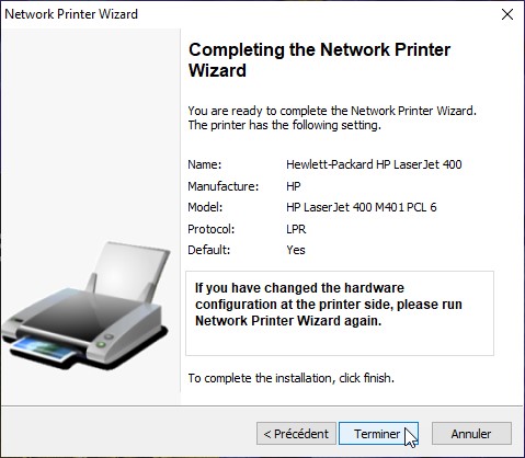 Une dernière boîte de dialogue résume les informations concernant l’imprimante que vous êtes sur le point d’installer. Cliquez sur Terminer pour finaliser l’installation :