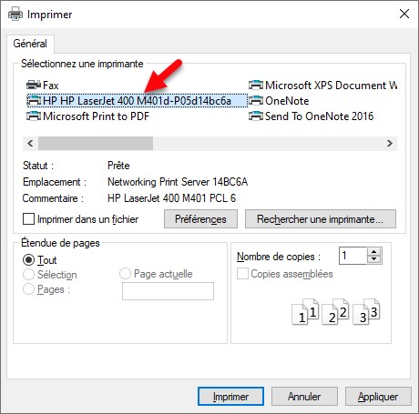 Après redémarrage, ouvrez une application quelconque et lancez une impression. Comme vous pourrez le constater, l’imprimante réseau apparait dans la liste des imprimantes utilisables :