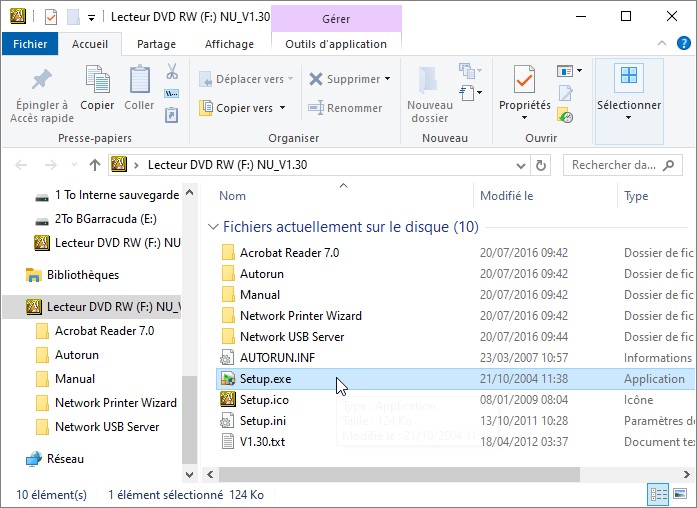 Insérez le CD d’installation fourni avec le serveur d’impression et exécutez l’application Setup.exe qui se trouve à la racine du CD :