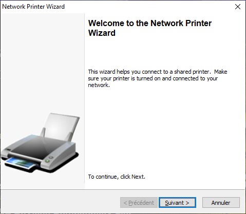 Cette action provoque l’affichage de la boîte de dialogue Network Printer Wizard. Cliquez sur Suivant :