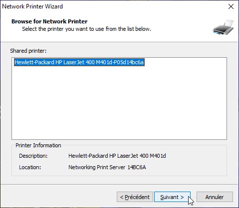 L’imprimante qui est connectée au boîtier est repérée. Sélectionnez-la en cliquant dessus puis cliquez sur Suivant :