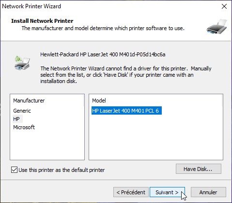 Si votre imprimante apparait sous Model, cliquez dessus. Dans le cas contraire, cliquez sur Have Disk et désignez l’emplacement du pilote d’impression à utiliser. Cliquez sur Suivant :
