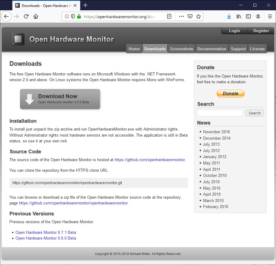 Vous pensez que votre ordinateur est en surchauffe ? Pour en avoir le cœur net, je vous propose d’utiliser le freeware Open Hardware Monitor. Rendez-vous sur la page https://openhardwaremonitor.org/downloads/ et cliquez sur le bouton Download Now :