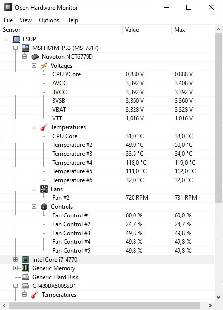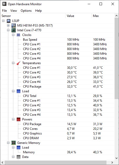 Une fois le fichier dézipé, double-cliquez sur l’application OpenHardwareMonitor.exe. Quelques instants plus tard, des informations détaillées sur la fréquence, la température, la charge et la puissance dissipée par le processeur s’affichent dans la section du processeur (ici Intel Core i7-4770) :