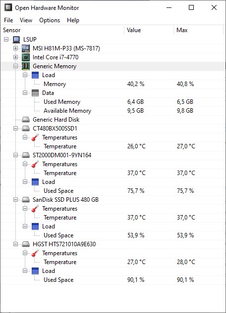 Mais aussi sur l’occupation de la mémoire centrale et la température de votre ou vos unités de disque/SSD :