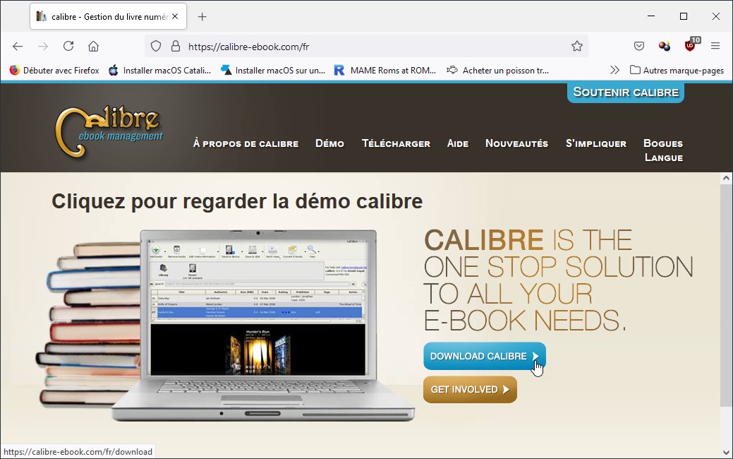 Ouvrez votre navigateur Web. Allez sur la page https://calibre-ebook.com/fr et cliquez sur le bouton DOWNLOAD CALIBRE :