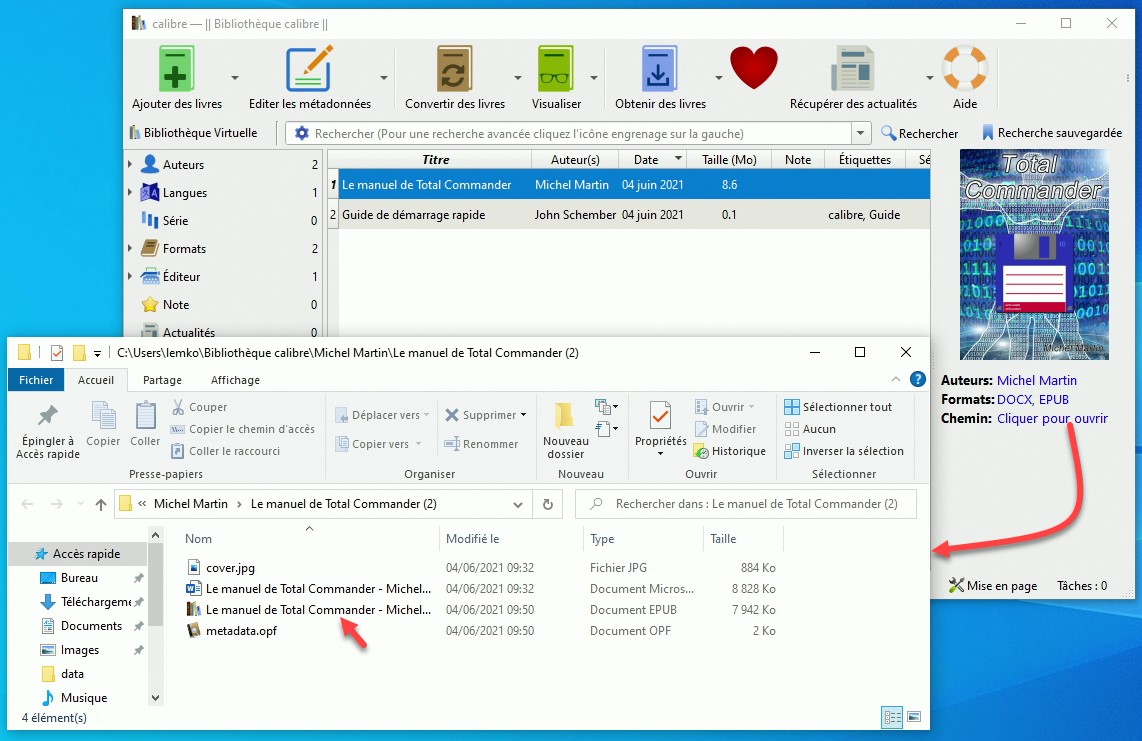 Cliquez sur OK pour lancer la conversion. La boîte de dialogue Convertir se ferme. Quelques instants plus tard, le livre converti se trouve dans le dossier que vous avez choisi lors de l’installation de Calibre. Cliquez sur le lien Cliquer pour ouvrir pour accéder au livre convertir dans l’explorateur de fichiers :