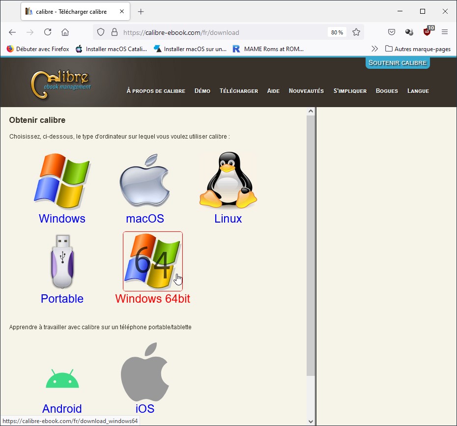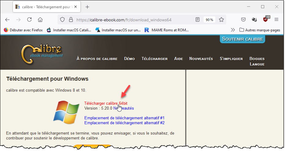 Une nouvelle page s’affiche. Téléchargez la dernière version de Calibre :