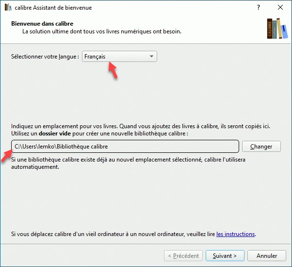 Le fichier téléchargé est au format MSI. Exécutez-le et acceptez les options par défaut de l’assistant d’installation. Au premier démarrage, on vous demande de choisir la langue de l’application et un dossier pour stocker les livres :