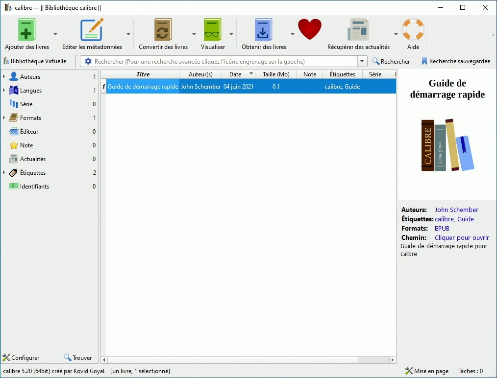 Pour exécuter Calibre, double-cliquez sur l’icône de raccourci qui a été déposée sur le bureau de Windows. Voici comment se présente sa fenêtre :