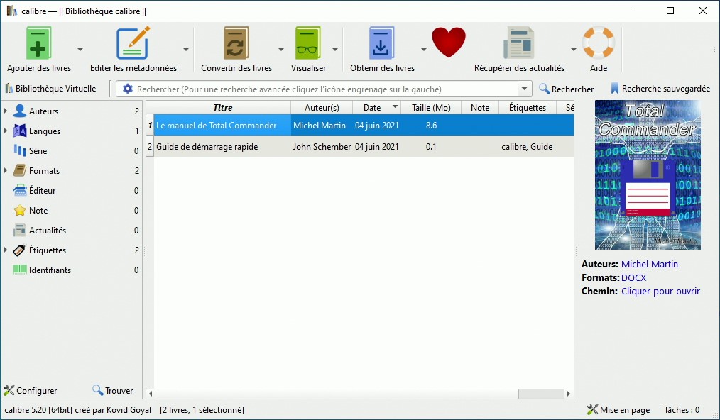 Pour convertir un livre, cliquez sur le bouton Ajouter des livres et désignez le fichier à convertir. Quelques instants plus tard, le livre apparait alors dans la liste centrale :