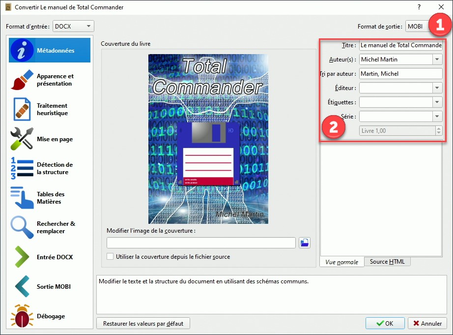 Assurez-vous que le livre à convertir est en surbrillance, puis cliquez sur Convertir des livres. La boîte de dialogue Convertir s’affiche. Le format de sortie correspond au matériel de lecture que vous avez choisi lors de l’installation. Si nécessaire, vous pouvez choisir un autre format de sortie (1) et éventuellement modifier les métadonnées attachées au livre (2) :