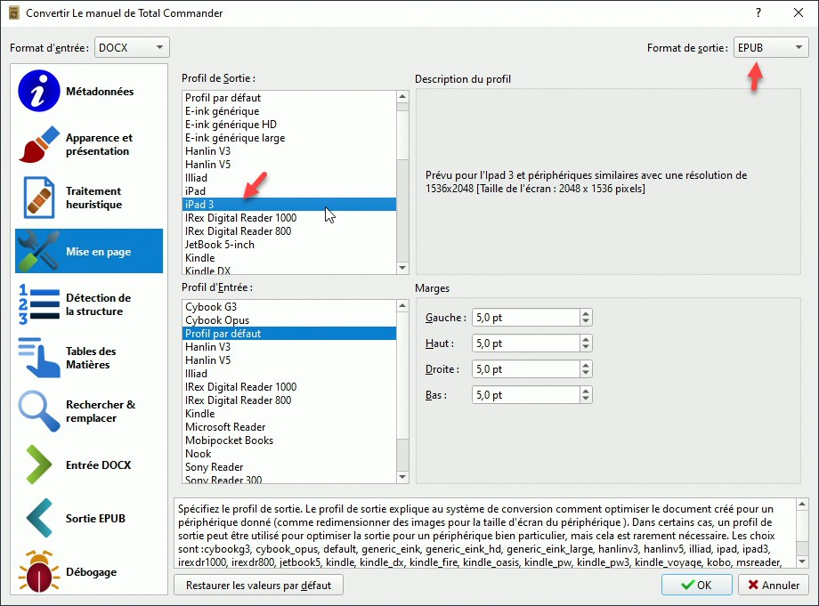 Si vous avez choisi un autre format de sortie, basculez sur l’onglet Mise en page et choisissez un matériel de lecture :
