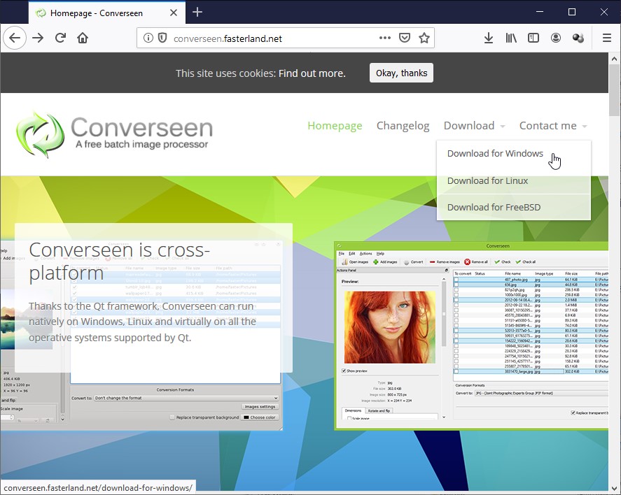 Connectez-vous sur la page http://converseen.fasterland.net/ et téléchargez l’application en cliquant sur Télécharger puis sur Download for Windows :