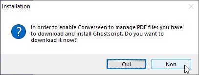 Le fichier téléchargé est un exécutable. Double-cliquez dessus pour lancer l’assistant d’installation. Acceptez les termes du contrat de licence, puis installez Converseen sur votre ordinateur. A la fin de l’installation, une boîte de dialogue vous informe que vous devez télécharger Ghostscript si vous voulez que Converseen puisse gérer les fichiers PDF. Cliquez sur Non :