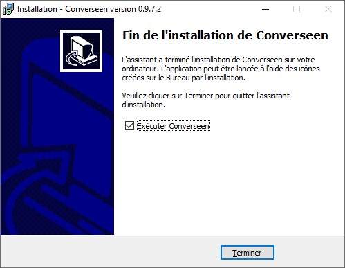 Pour fermer la fenêtre de l’assistant et lancer Converseen, cliquez sur Terminer (par la suite, vous pourrez lancer l’application en utilisant le menu Démarrer) :