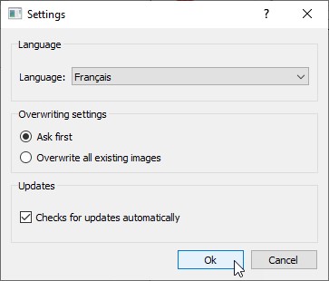La fenêtre de Converseen s’affiche. L’interface est en anglais. Pour l’afficher en français, lancez la commande Settings dans le menu File. La boîte de dialogue Settings s’affiche. Choisissez Français dans la liste déroulante Language et cliquez sur OK :