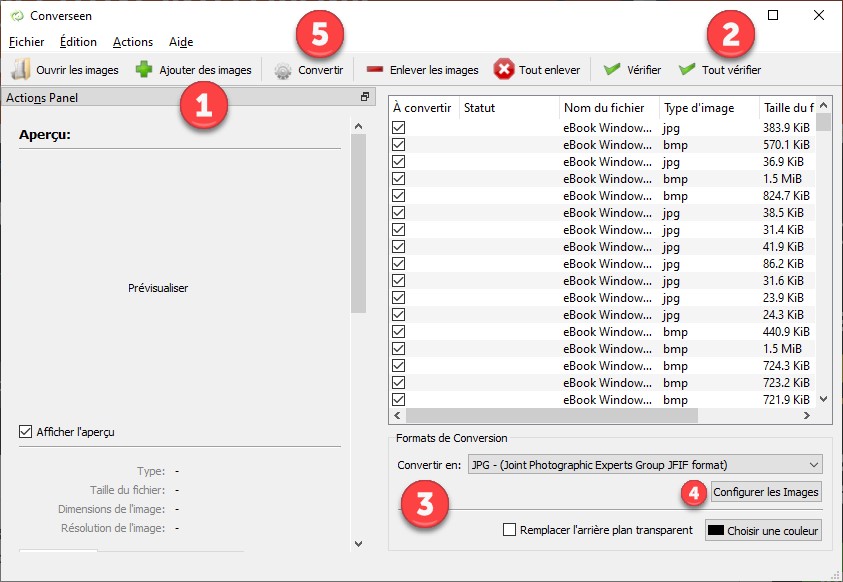 Cliquez sur l’icône Ajouter des images (1) et désignez les images que vous voulez convertir. Cliquez sur Tout vérifier pour sélectionner toutes les images (2). Choisissez un format de sortie dans le groupe d’options Formats de Conversion (3). Si nécessaire, cliquez sur Configurer les Images (4) pour paramétrer la qualité de la conversion. Cliquez enfin sur Convertir (5) pour lancer la conversion :